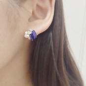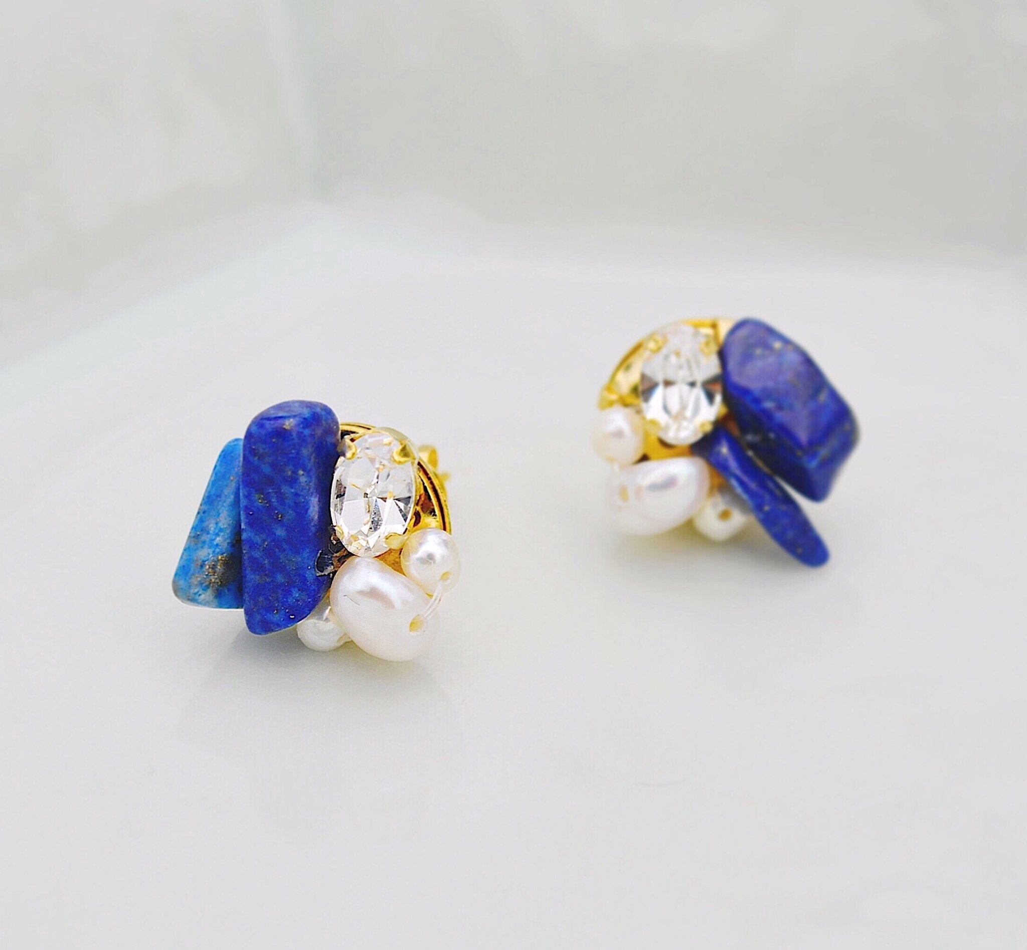 天然のラピスラズリ、淡水パールを2粒ずつ留め付け、プチサイズのクリスタルを添えました。